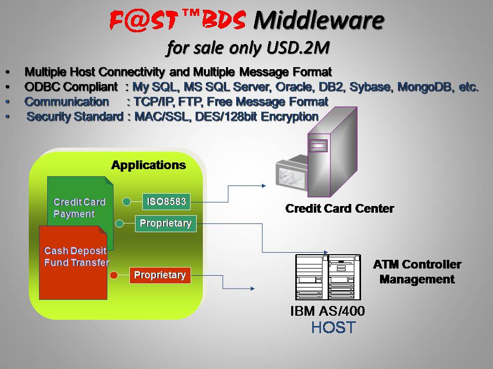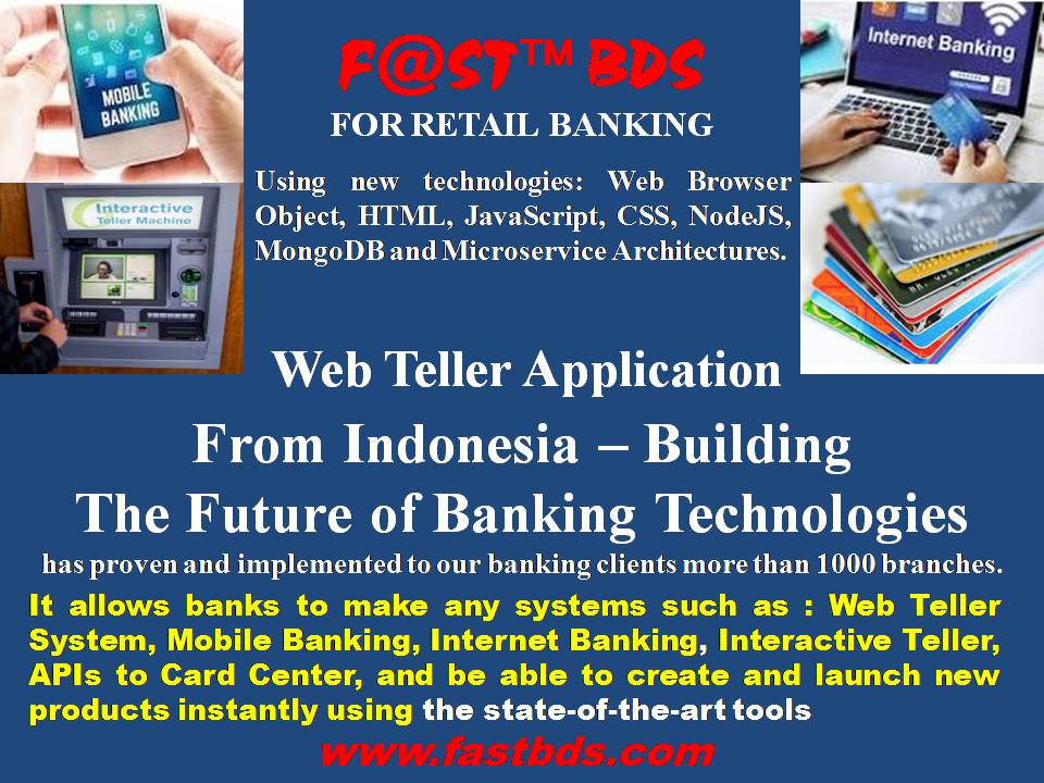 Now, more than ever, banks need to quickly and economically develop, implement and easily connect all branches to host core banking system. They must also be able to efficiently communicate with all these branches, which may be located in remote locations of vast countries like Indonesia, China, India and United States etc., even if the telecommunication line is in poor condition. Saving time in application development by employing new technology is of the essence for the banks to stay competitive and grow. To save time and cost for the customers in software development, deployment, modification, addition and distribution for branch system, we have spent more than three years in research and development to develop Next-Gen Web Teller Application - Branch Delivery System (BDS) called “F@ST™BDS” − a major breakthrough in BDS application software. Our specialists who developed this system have more than 25 years of combined banking application development and implementation experiences.
