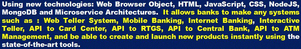 Why our F@ST™BDS is Artificial Intelligence (AI) in Banking, cause It allows banks to make any systems such as : Web Teller System, Mobile Banking, Internet Banking, API to RTGS, API to Central Bank, APIs to E-Commerce, APIs to Card Center, Open Banking APIs and able to create and launch new products instantly. Until today all AI Tools in the cloud can only generate a website, convert text to image, edit image and video, advance search engine with user prompt and display in more detail, but can not allows users to make any systems.