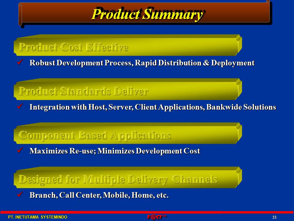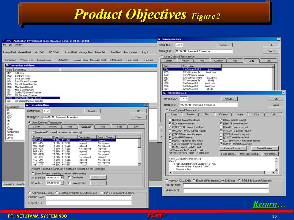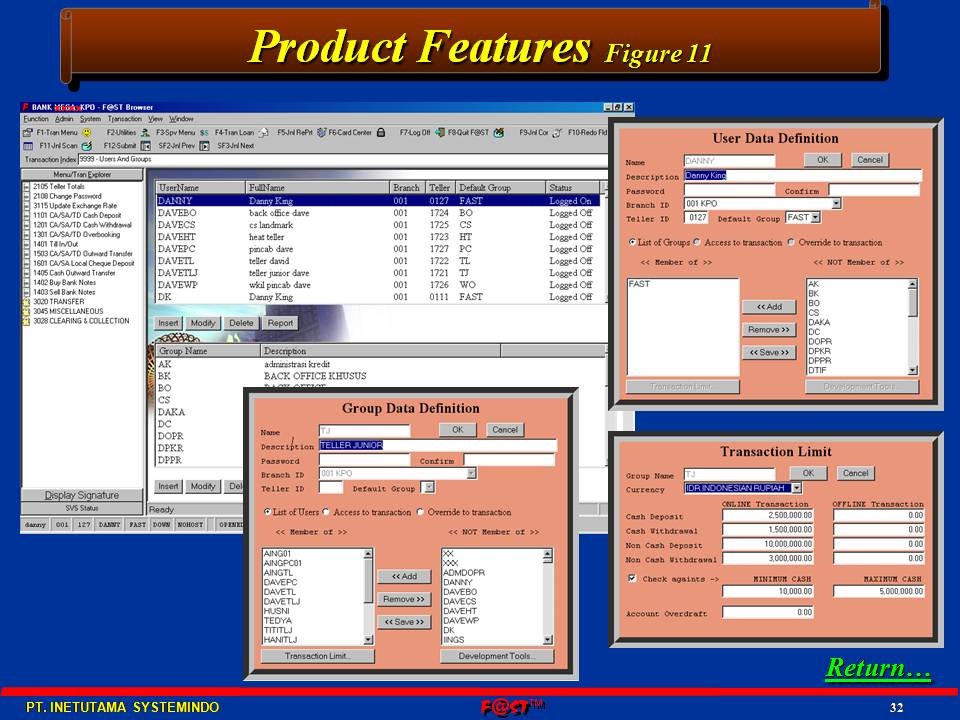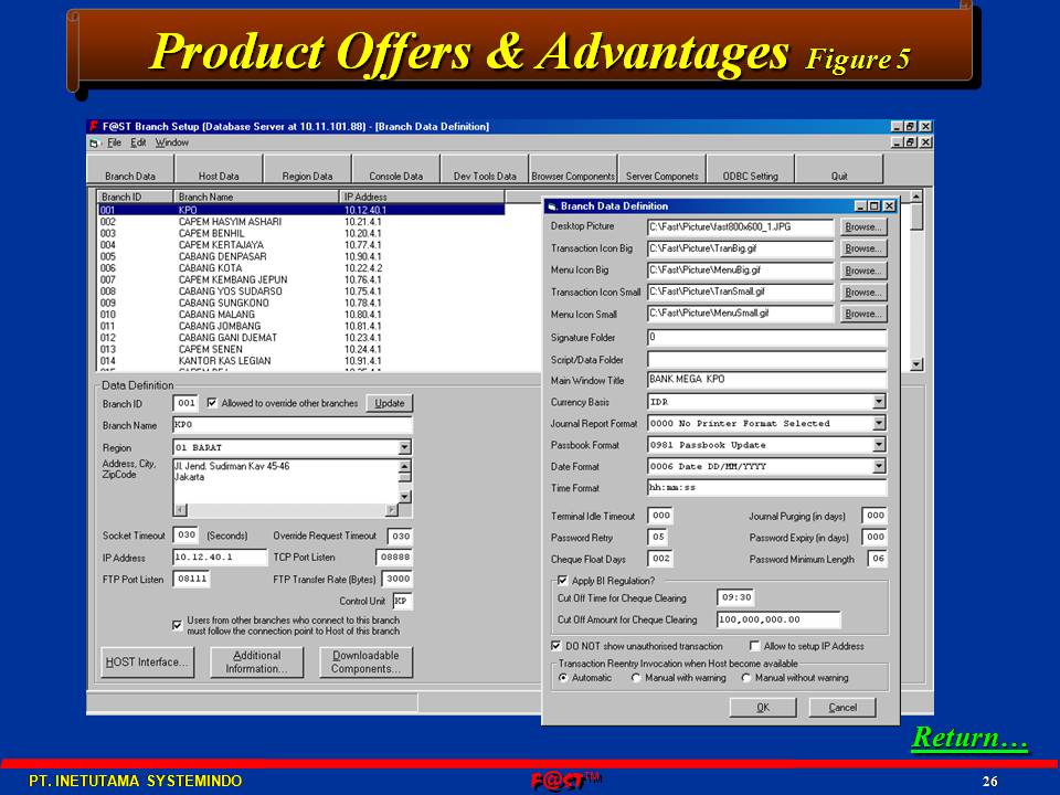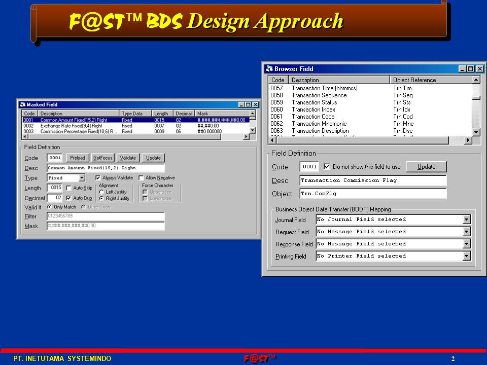 F@ST™BDS - (Branch Delivery System) is an advanced web teller applicatiojn and branch system. It automates all aspects of system development using state-of-the-art tools, which can cut down development and implementation time, and hence cost, by more than 80%. Transaction processing, cash control, signature verification, pin-pad transaction, cross currency and clients host online/offline transaction using TCP/IP protocol with high security
