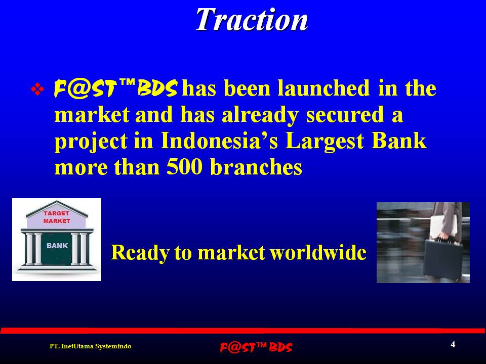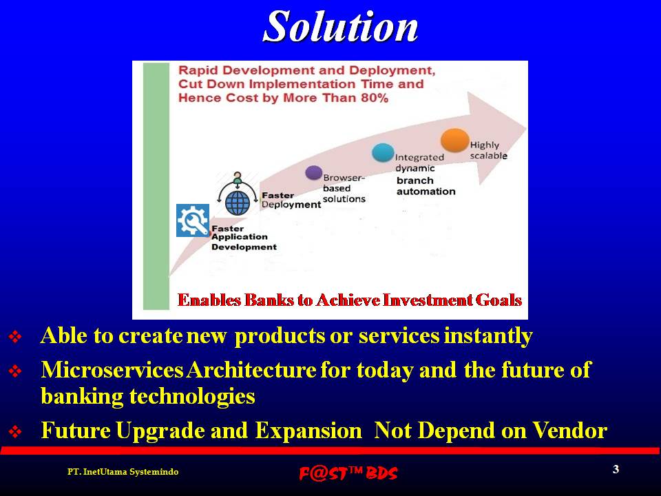 F@ST™BDS Technology pays great attention to our clients’ needs. A major part of our investments is dedicated to the migration of the systems installed by our clients, with particular interests for banks in Indonesia. This base of banking clients and systems represent a major strength, and a major commitment to the future. This is a strength and a commitment from which also all new banking clients will benefit, because the expertise and experience accumulated through projects for all these banks are embedded in our banking offerings, and in the people who makes the systems work.